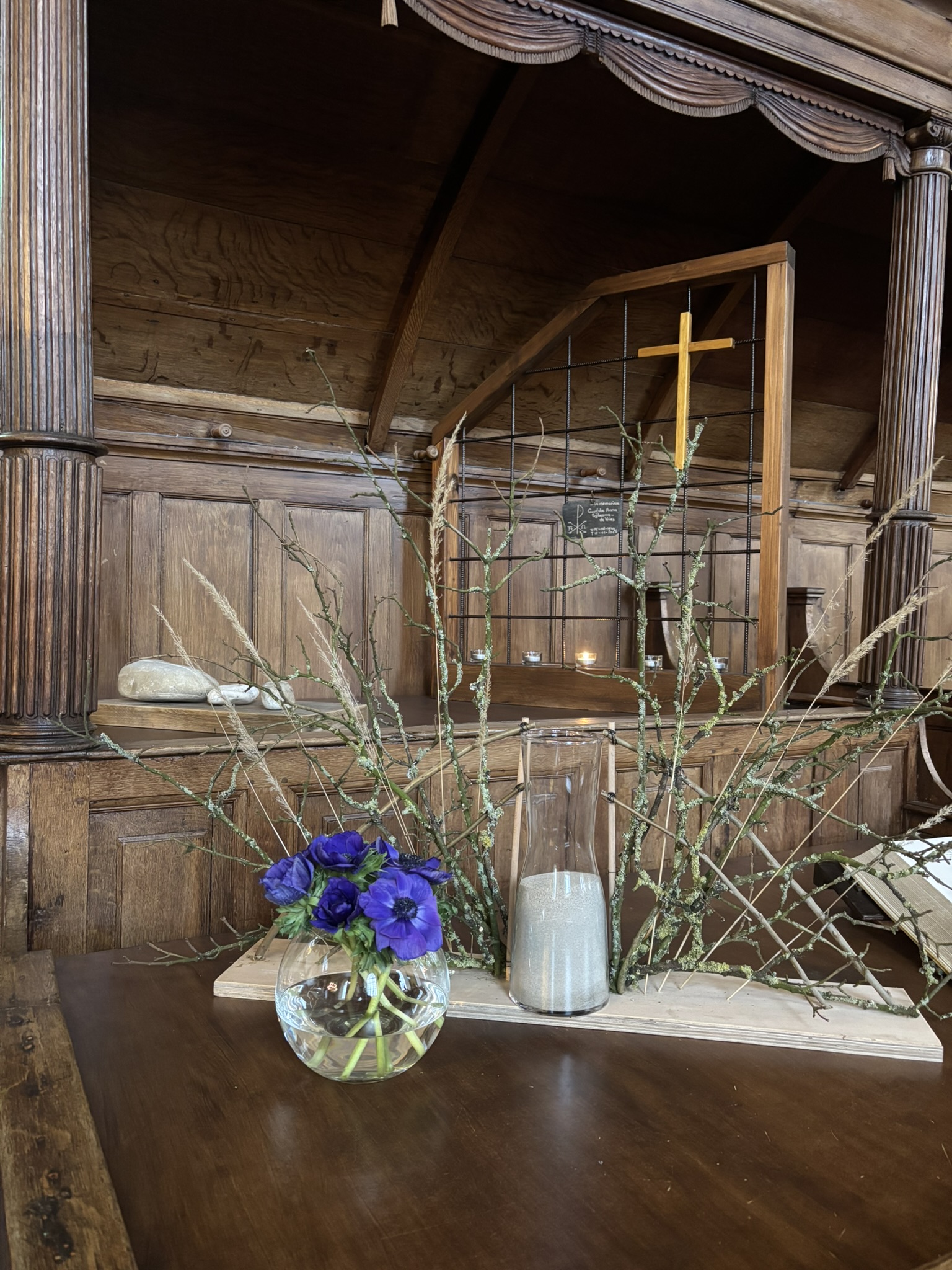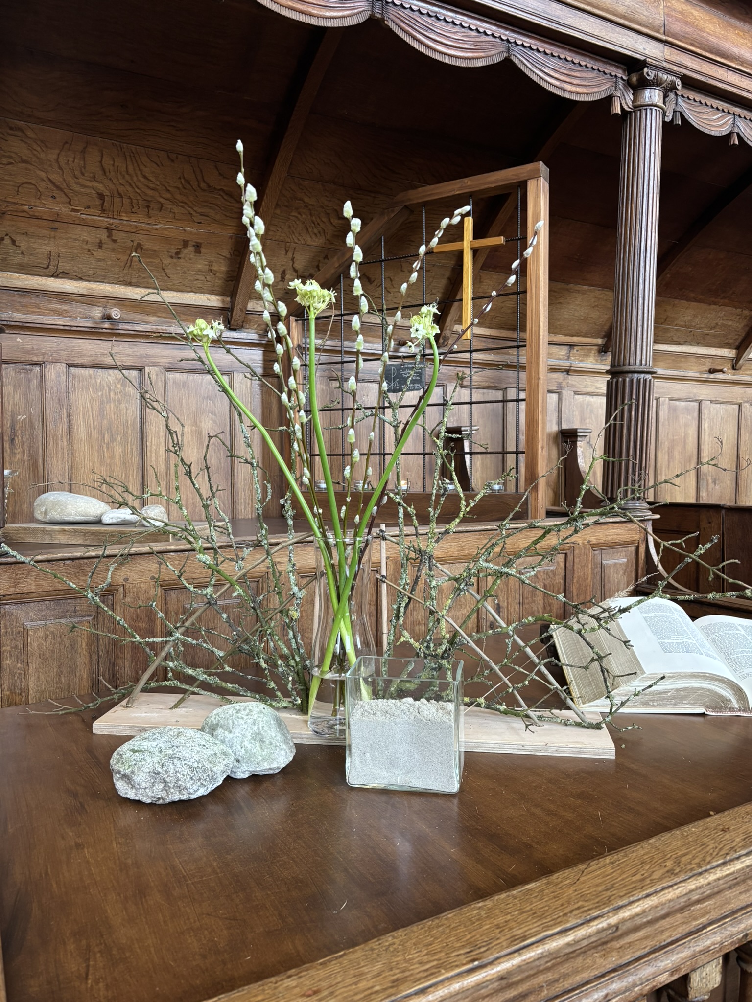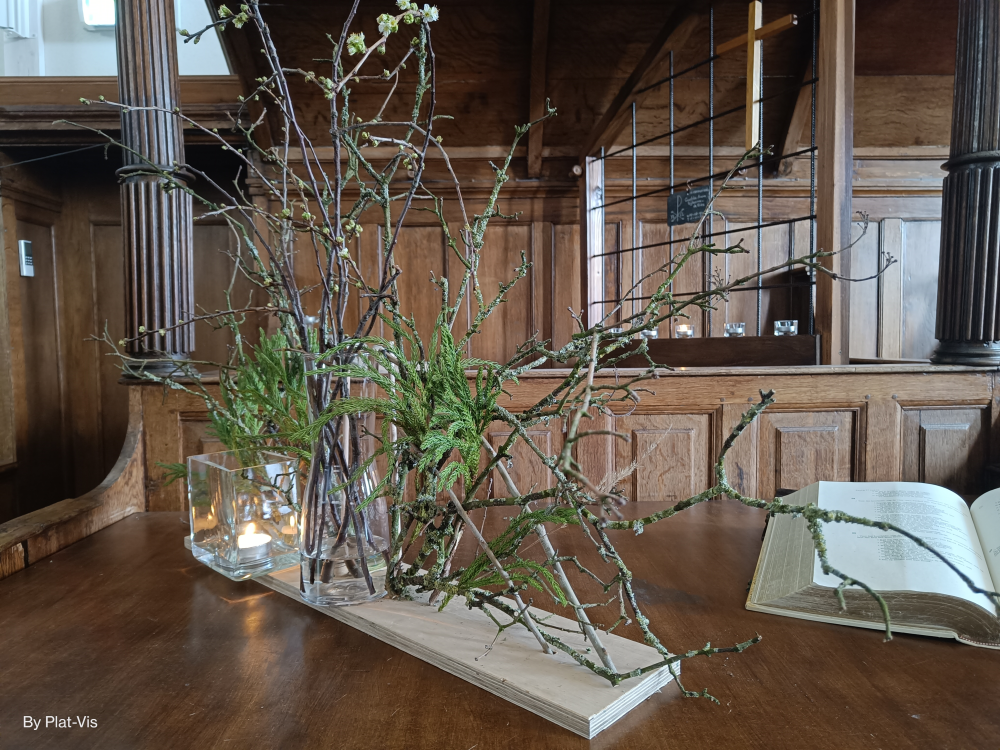 Het zichtbaar maken van het werk van God kan met wit bloeiende bloesemtakken die in de grote vaas worden geplaatst en die verbinding maken met de waaier. Veel bloesems zijn familie van de roos, een vijftallige bloem. Het getal 5 is het getal van de mens, de mens met zijn 5 zintuigen. Met die zintuigen kunnen we de ander zien, voelen en horen. Bloesems zijn bedoeld om vruchten te dragen, vruchten die ook door het doorwerken van de Geest kunnen ontstaan. In het kleine vaasje wordt een witte kaars geplaatst, teken voor het licht van de wereld.