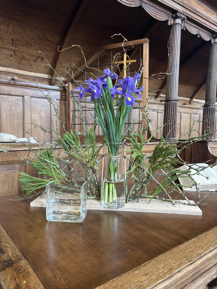 De ontmoeting bij de bron staat centraal in deze schikking. De grote vaas is gevuld met water en irissen en de middelgrote vaas met water als verwijzing naar de bron. De iris is driekleurig en is een drietallige bloem, een verwijzing naar de Vader, de Zoon en de heilige Geest. De kleuren van iris zijn blauw, wit en geel. Blauw – de kleur van de lucht, de hemel en het water; wit – de kleur van de onschuld en geel - de kleur van het goddelijke.